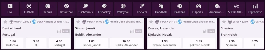 Neben klassischen Casinospielen kannst du auch auf eine breite Palette an Sportwetten setzen. Fußball, Tennis, Basketball und viele andere Sportarten stehen zur Auswahl. Außerdem wächst das E-Sports-Angebot stetig, sodass du auch auf spannende Turniere in Spielen wie League of Legends oder Dota 2 tippen kannst.