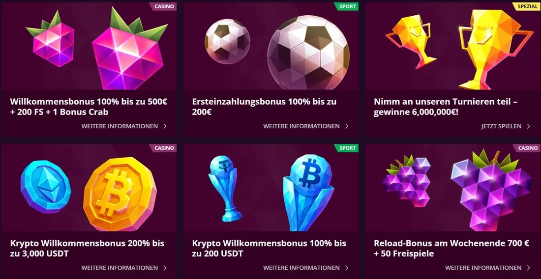 Der Willkommensbonus lässt keine Wünsche offen: 100 % auf deine erste Einzahlung bis zu 500 € + 200 Freispiele und eine exklusive Bonus Crab. Mit diesem Paket kannst du nicht nur deine ersten Schritte im Casino mit extra Guthaben und Freispielen machen, sondern auch von weiteren Belohnungen durch das Sammeln der Bonus Crab profitieren.